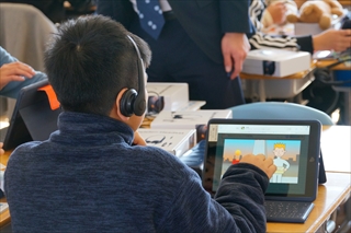 こちらは,英会話をAIが評価します。音声認識をするものは,昔からゲーム機でも存在していましたが,そこにAIがかんできました。外国語の授業や,英会話の練習そのものが,なにか変わるかも!?子供たちは,ヘッドセットを着けて学習に取り組んでいました。
