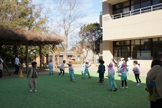 今日は,となりの幼稚園から1Bのみんなと遊ぼうとやってきました。みんなでドッジボールして楽しかった!