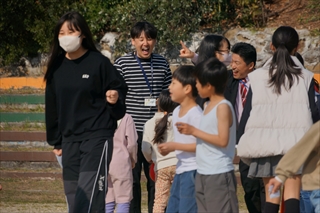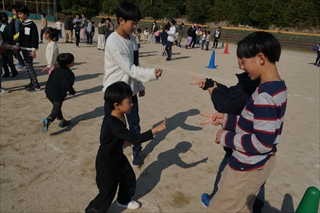 運動場では,1年生と6年生が勝ち抜きジャンケンをしていました。負けたら戻る。行ったり来たり(笑)。副校長先生もいないな~と思っていたら,こんなところに誘われていたんですね。1A担任とともに,子供たちと一緒に盛り上がっていました。