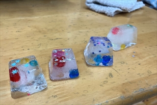 星のスパンコールが沈み,ビーズが浮いていたので,それぞれ混ざることなく凍ったものもあります。でも,それはそれでいい出来です。向こうに雑巾が写っているのですが,言わなければわかりません(笑)。