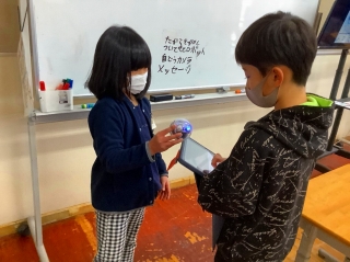 25分ほどをつかってプログラムを作成したり,実際に動かして試したりしました。この中で,「上手く行った!でも,こうなった方がもっといい」「写真も撮れるけど,反応がおそいから・・・」「宝探しをしてセンサが明るいところに来ると声が流れるけど,明るくしたままだとずっと同じメッセージが流れてしまうな」などのように,とりあえずできたとしてもさらにいいものを目指そうとしていす姿が大変嬉しかったです。そして新1年生を迎えようとする気持ちの大きさにもニンマリとしてしまいました。成長しましたね~。