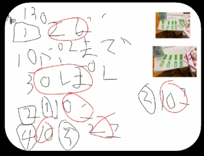 数え棒などの具体物を使って考えた記録として,写真にとって貼り付けていたのには,驚きました。以前,方法としてこんなやり方を教えてきましたが,この学習でこのようにしなさいという指示は出していません。いつもこの子たちがつくる板書記録が,タブレット上で,しかも少人数でもできました。