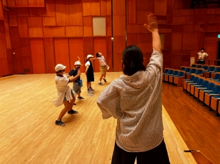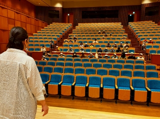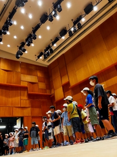 さて,ホールに着いた子どもたちは,いきなり舞台裏から通され,楽屋の前を通って下手(舞台に向かって左側のこと)からステージへ。誰もいない客席となんだかちょっと響く自分の声に気分が高まり,目をキラキラとさせていました。担当の方が,声の届き方や目線の送り方,ステージ上での人の見え方などを説明してくださいました。