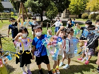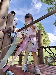ナイロンテープや紙テープ、毛糸などのゆれる材料を使って、ひらひら揺れるときれいな飾りを作りました。子どもたちは飾りを工夫して付け、揺らして試しながら製作していました。出来上がった飾りをもって、プレイランドで鑑賞しました。「ここにかざるときれいだな」「かぜでゆれてるよ」「もってすべりだいをすべったらどうなるかな」と揺れる様子を楽しんでいました。