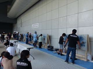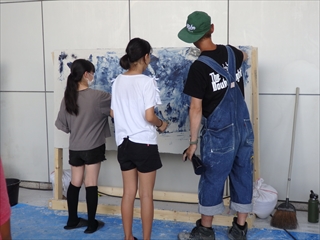 アート体験。白いキャンバスに藍の染料をコテで伸ばし、思い思いに描いていきます。