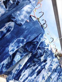 持って来たTシャツやタオルなどを染料に漬けたり、すすいだり。ジャブジャブ…。