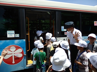 とてもいいお天気の中、職員駐車場で1年生のバスの乗り方教室が開かれました。