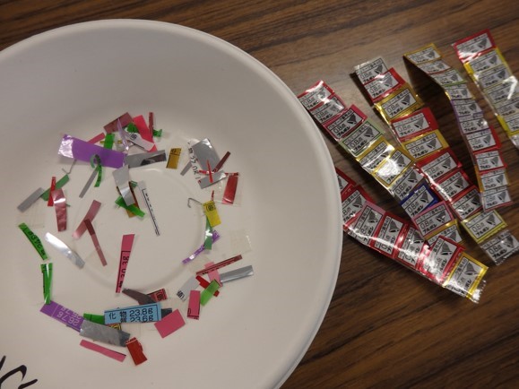 ベルマークは、点数が数えやすいように、同じメーカーの同じ点数のものを10枚ずつセロハンテープでまとめていきます。