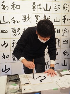 松村先生のお兄さん「松村博峰」先生から静川先生の書いてきてくれた作品を見せてもらって、「筆の上の方を持って書きましょう」とアドバイスを貰い、いざチャレンジ!