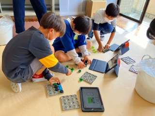 子供たちのタブレットに図面が送られています。そして,子供たちはそれを手がかりにキャップをはめ込みます。