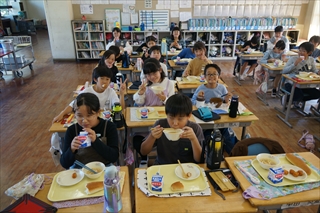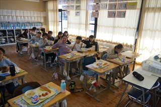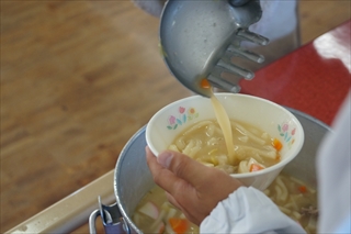 子供たちは,どんどん準備して,学校生活の中でかなり大きな位置を占めるおかわりタイムも楽しく終えました。小柄な女の子もうどんを山盛り食べたり,笑顔でパンを頬張る男の子も。