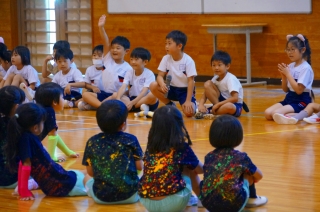 1Bとの交流学習で,ミニミニ運動会をしたそうです。僕が見に行くと,体育館ででっかいオセロをしていました。カラフルな衣装もいいですね(o^ー’)b
