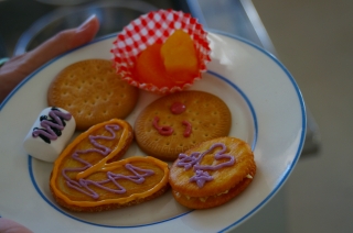家庭科室から甘い香りがしてきたので寄ってみると,かわいくデコったお菓子が!!先にここに来ればよかった~!生クリームぶくぶくぶく~ッてやれたのに(・A・)。