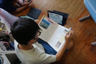 床に座り込んで調べ学習。飛鳥奈良時代で,冠位十二階の制を調べるとか。でも,白村江の戦いのページだったけどいいのかな?