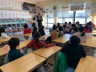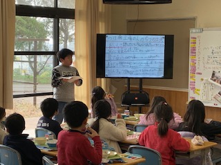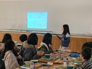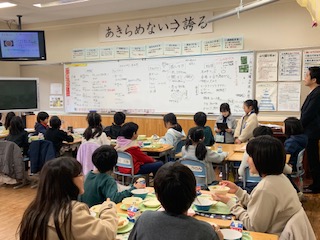 給食時間には、たくあんがどのようにつくられるのかということを工場の方の思いや工夫を中心に全学級に3Cの子どもたちが伝えに行きました。