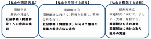 「社会的事象を構想する過程」とは,問題解決に向けて,自らの社会的事象へのかかわり方や問題解決の方法を創造したりして,問題解決に向けて社会に参画していく過程である。