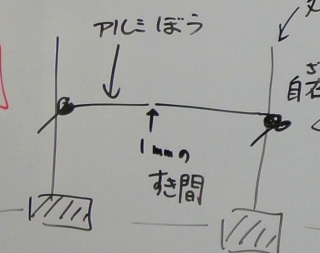 また,試験片をどうしようという話になりました。前時で用いた150mm四方のアルミニウム板では熱くて物差しを当てて測ることはむずかしくなります。担任は,微小な変化も重なれば大きくなることを示し,長ければ長いほど目に見える可能性は高いことを知らせます。子どもたちは,かなり悩みましたが,最終的に1人の子どもが次のようなアイデアを出しました。