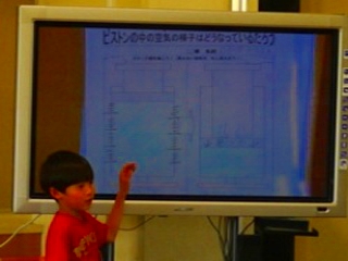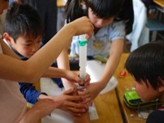 教師は「この中(ピストン)を何か考える方法ってなに?どうなってるかな?」と空気が見えやすい実験方法について問うた。子どもたちからは「水に絵の具を混ぜて入れる」「ジュースを入れてみてもいい」「お茶が…」など液体を入れる意見が出された。