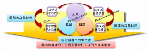 また,五感を通したリアルな活動や体験を,各教科等の内容と関連付けることで,人々・社会・自然に関わる見方・考え方を生かし,多様に表現しながら探究しようとする態度を育てることをねらいとしている。