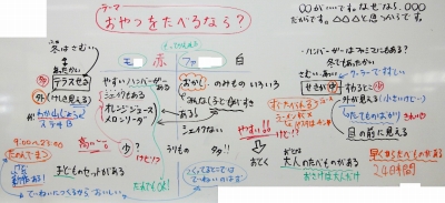 第1回目は,「おやつを食べるなら?」というテーマにしてみました。探検時には,子どもたちもジュースなどをコンビニかハンバーガー屋さんのどちらかで購入したためです。また,どちらの店にもおやつを食べるスペースがあることから,このテーマにしてみました。探検時の体験などを生かして,おやつを食べるならどちらの店で食べるか,立場を明確にして議論してみました。