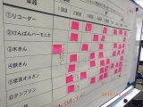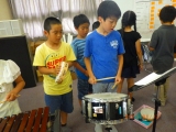 パートの重ね方を考えた拡大ワークシートを見ると,3グループが何やら書き込みをしています。よく見ると,小太鼓のパートの所に「大」「小」の文字があります。「大・小って何かな?」と3グループさんに尋ねると,「強弱を考えた」とのこと。実際に子どもたちには,強弱をつけて小太鼓や木琴,鉄琴の音を出してもらいました。以前に学んだことを覚えていて,バチの持つ位置を変えたり,マレットの種類を変えたりすることで音が変化することを確認し合う姿が見られました。