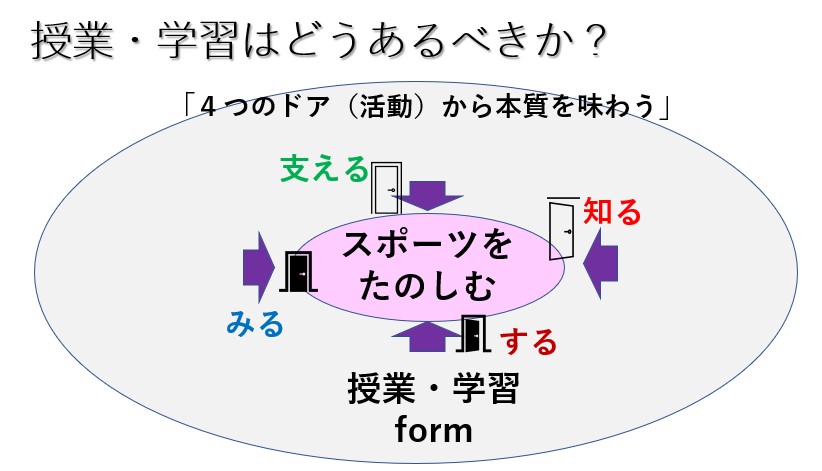 教師は,子供が「する」「みる」「支える」「知る」の活動を経験し,スポーツをたのしむことを味わえるような環境を整えることを重視する。